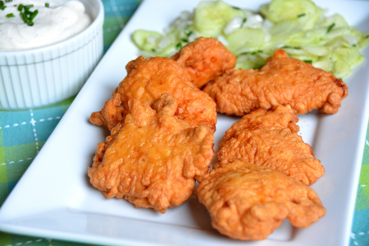 Polędwiczki drobiowe w cieście naleśnikowym, ziemniaki/kluski/frytki, surówka